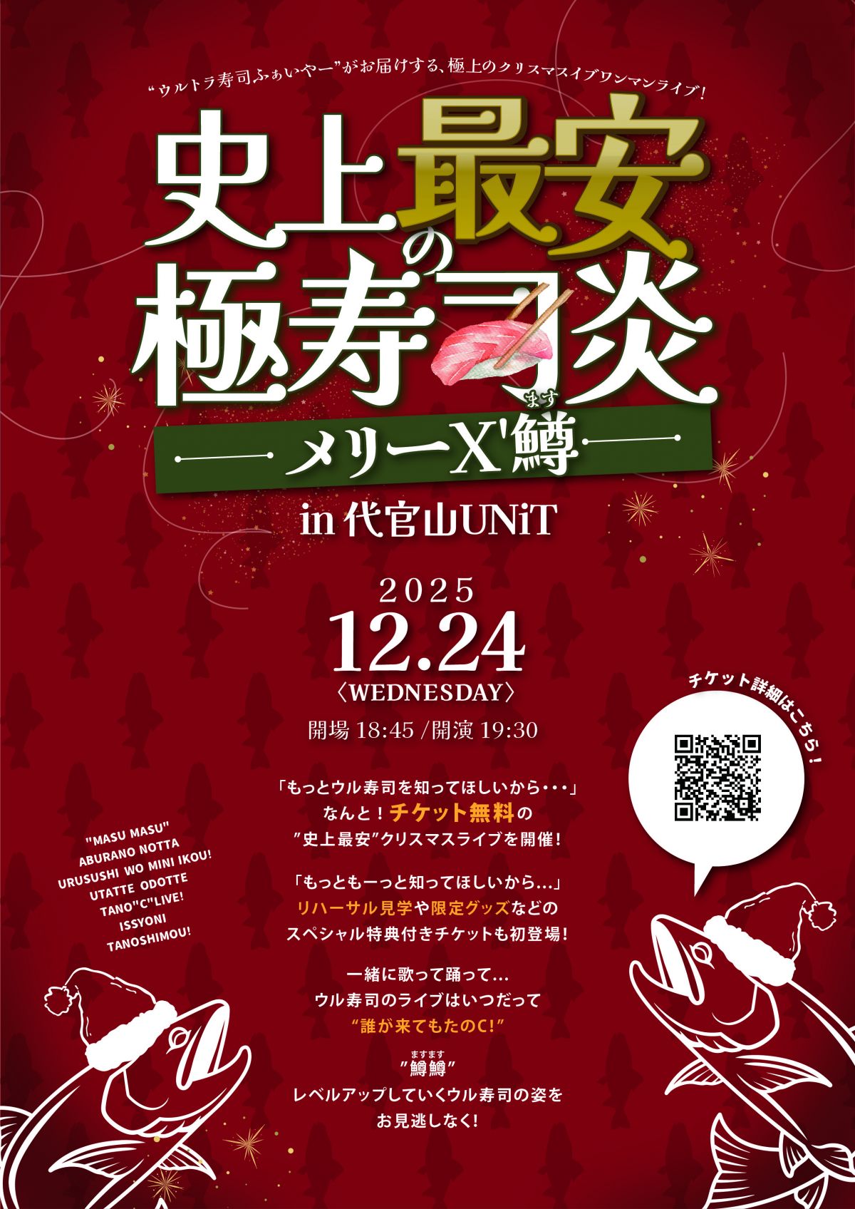ウル寿司からのクリスマスプレゼント「史上最安の極寿司炎-メリーX'鱒-」Aチケット一般販売が2025/10/30(木) 10:00より発売します。